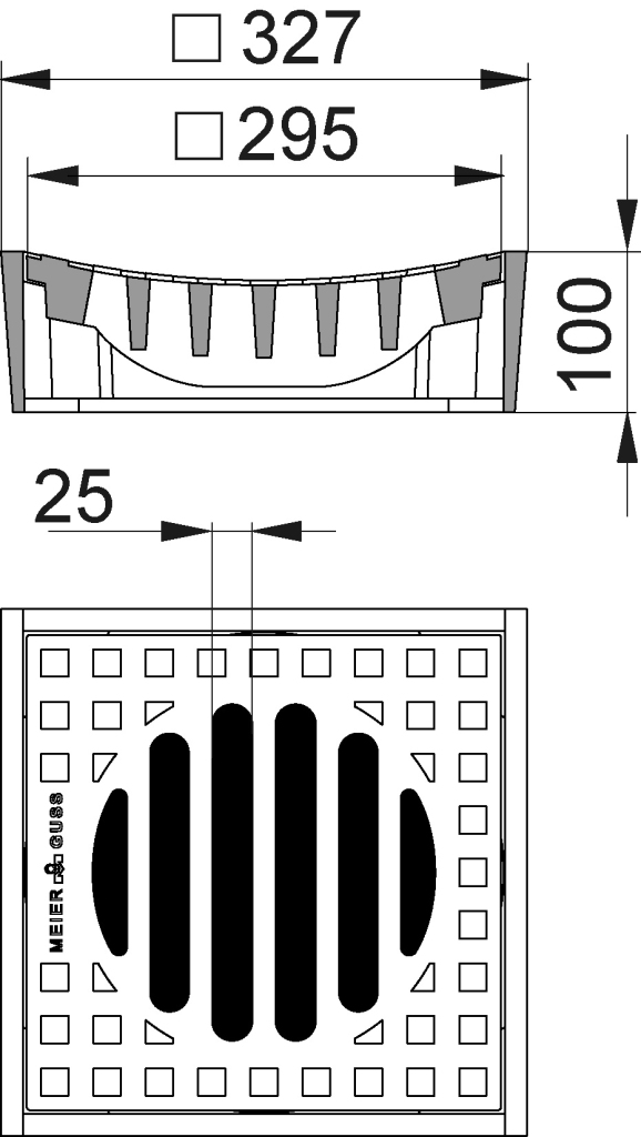 327x327mm, Rinnenform, 25mm Schlitzweite, Einlaufquerschnitt 246cm2